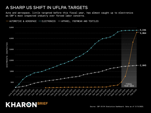 In January and February, the start of fiscal year 2025’s second quarter, 96 percent of the 2,918 shipments that CBP inspected for UFLPA concerns came from the auto and aerospace industry, which until last fall had received little such scrutiny. Now, as inspections of electronics have dropped off, auto and aerospace is on pace to be CBP’s top forced-labor target in aggregate.